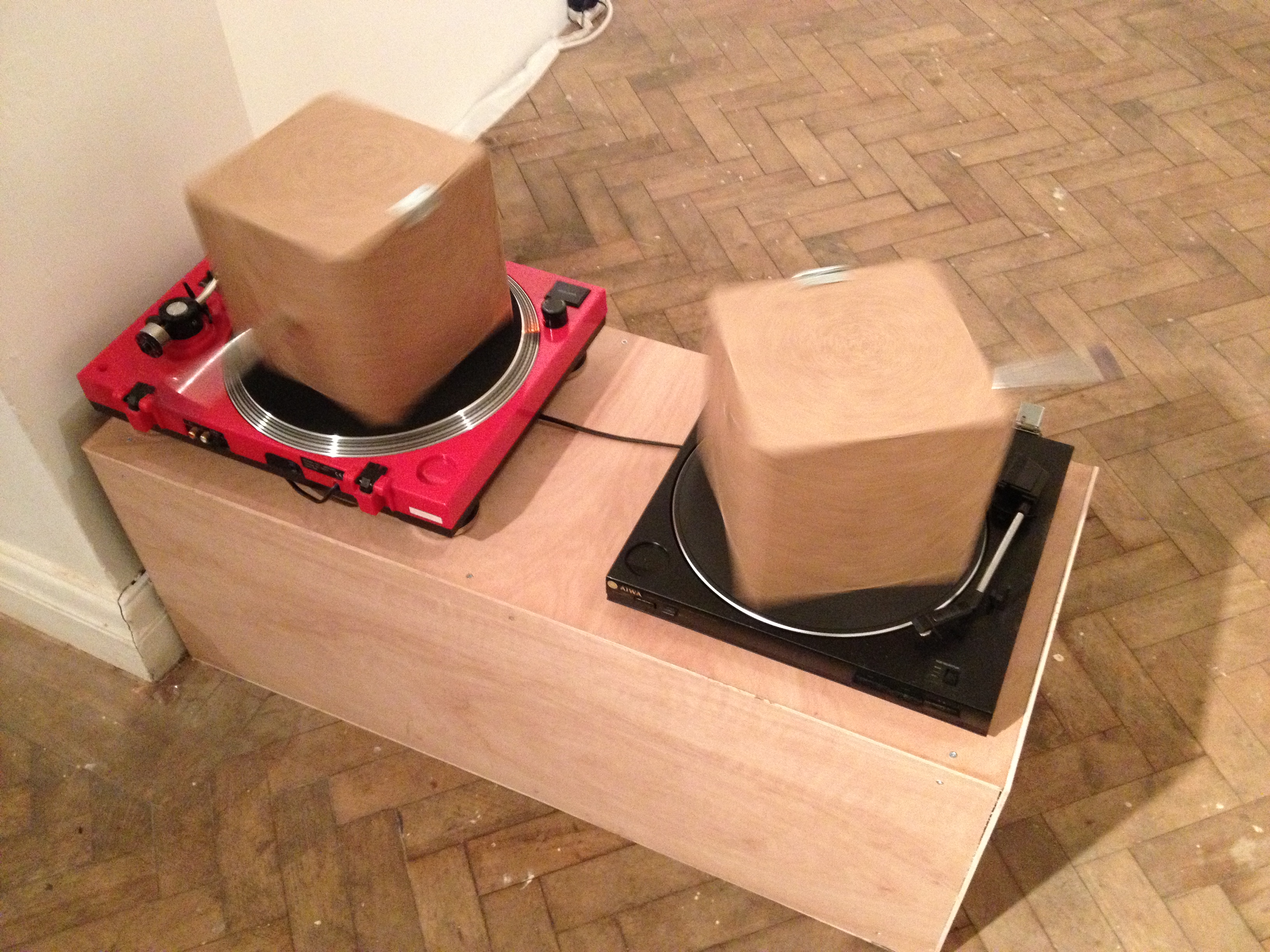 ‘Remembrance’ is a kinetic sound sculpture that is intended as a meditation on memory and the imperfections of the human process of remembering. A tape head, extracted from a cassette walkman, intermittently comes into contact with strands of cassette tape as two turntables rotate. The tape – cut-up from charity shop cassettes – carries music that was, in the past, experienced lucidly by its previous owners, yet in the present exists only fragmented, imperfect and periodic.